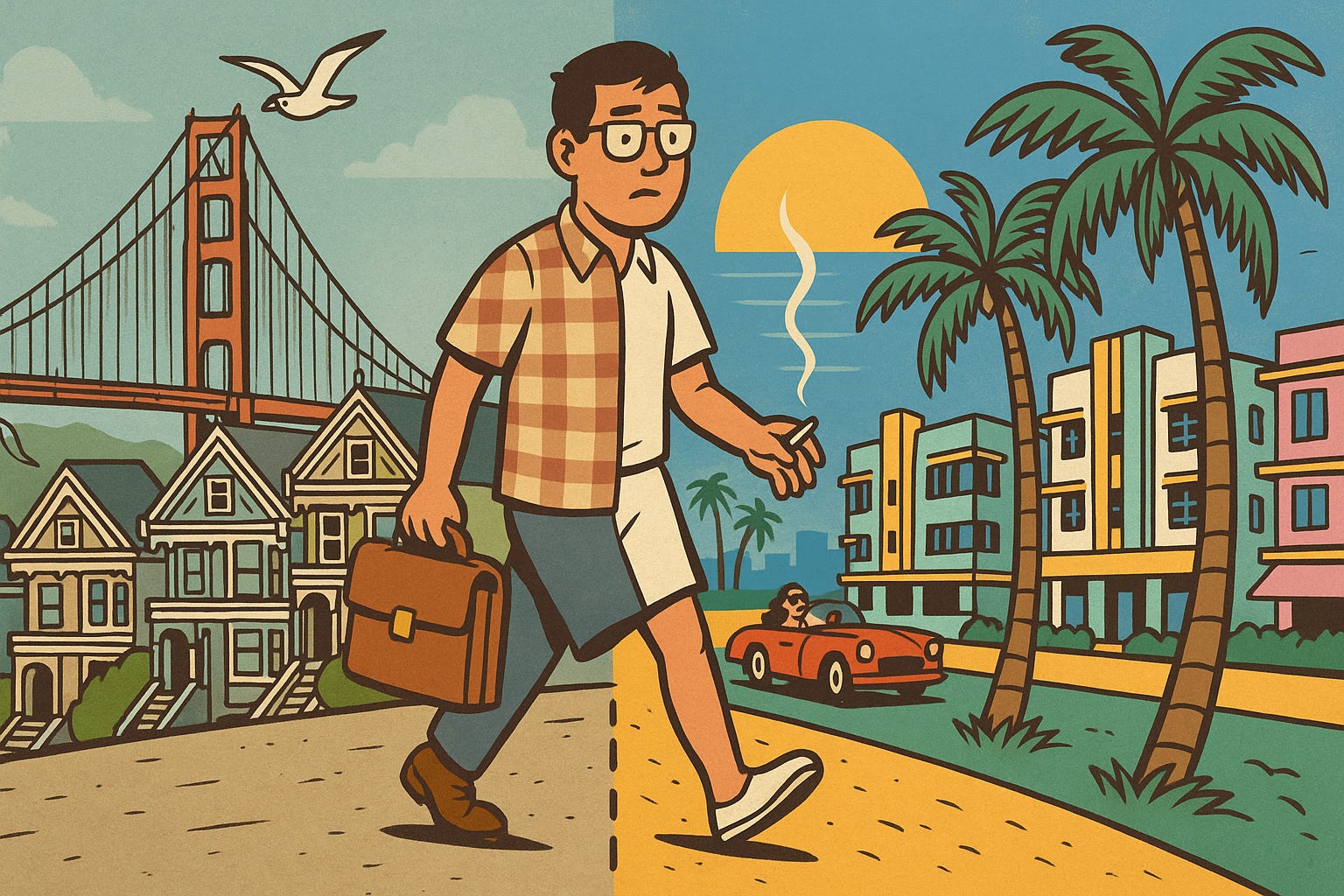 So there’s a scene in Will Smith’s Miami video where two girls are in a convertible, and one of them is Eva Mendes, and they’re all “Bienvenido a Miami”. At the same time, the camera pans out, and they’re driving over a causeway. I drive that causeway to my co-working space. Then there’s the scene where Will Smith’s posse is walking in front of a bunch of art deco hotels, and then I realize that it’s two blocks from my house. There are Brazilian models, Italian families of five arguing with their hands outside of the Starbucks where you buy your morning coffee, and a Russian girl who nearly pushes you aside because she can, and she’s wearing a fur coat because it’s 70 degrees, and when else is she going to wear fur?