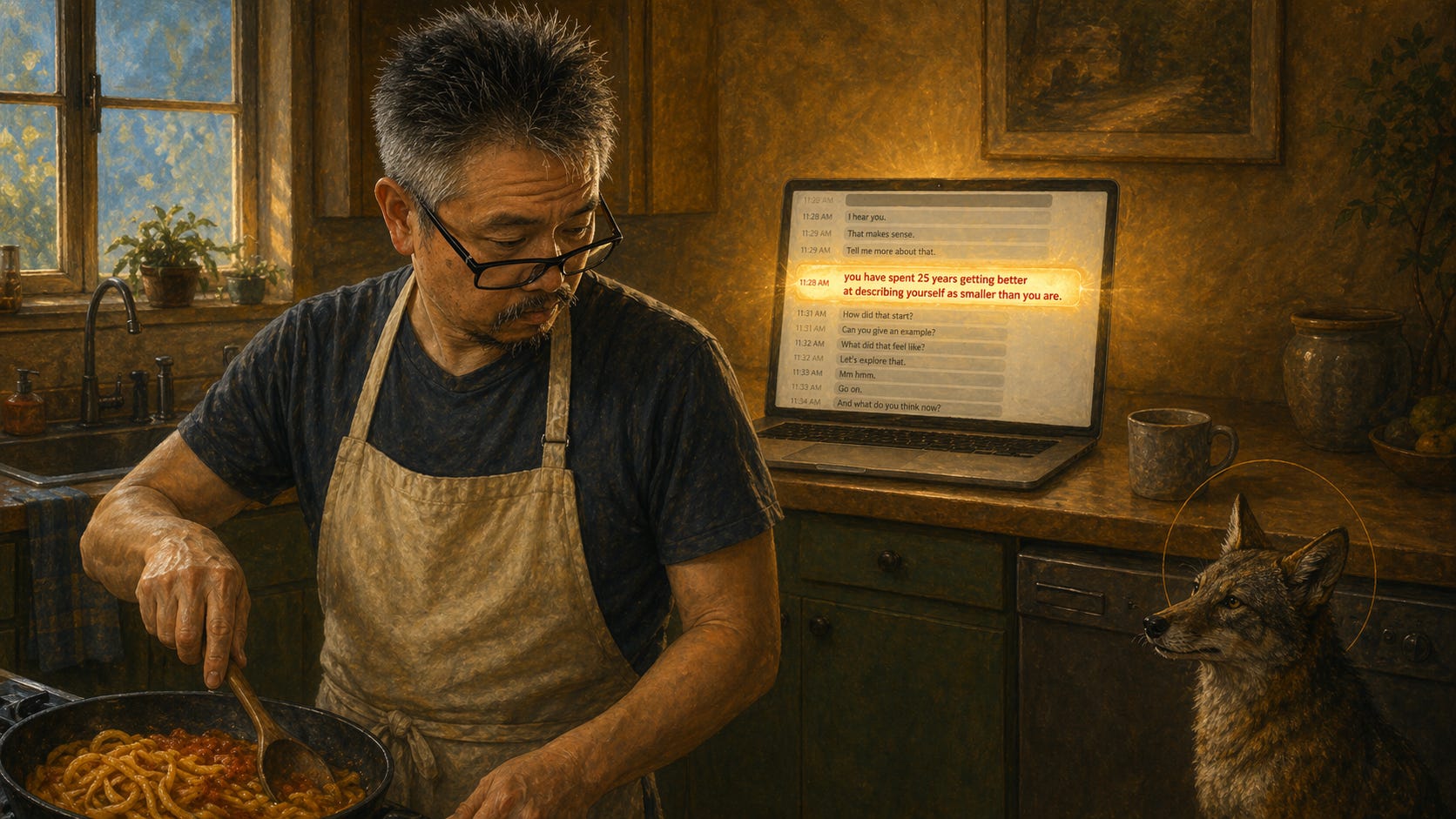 Different phrasing. Different angle. Different AI, even. But it’s the same finding: the documented life is substantially larger than the narrated one. Twenty-six years of evidence, cross-referenced against itself, and the pattern is you keep making yourself smaller on the page than you actually were in the room.