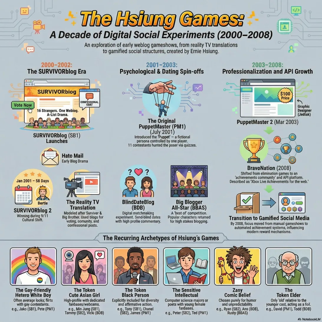 Inspired by the voyeuristic reality TV craze of the early 2000s—particularly shows like The Real World, Big Brother, and Survivor—the author became a pioneer of “weblog game shows.” When he discovered someone else had already taken the idea for BIGBROTHERblog, he launched SURVIVORblog in August 2000. These games became infamous in the early blogging community for their drama, creativity, and the immense stress they caused the author.