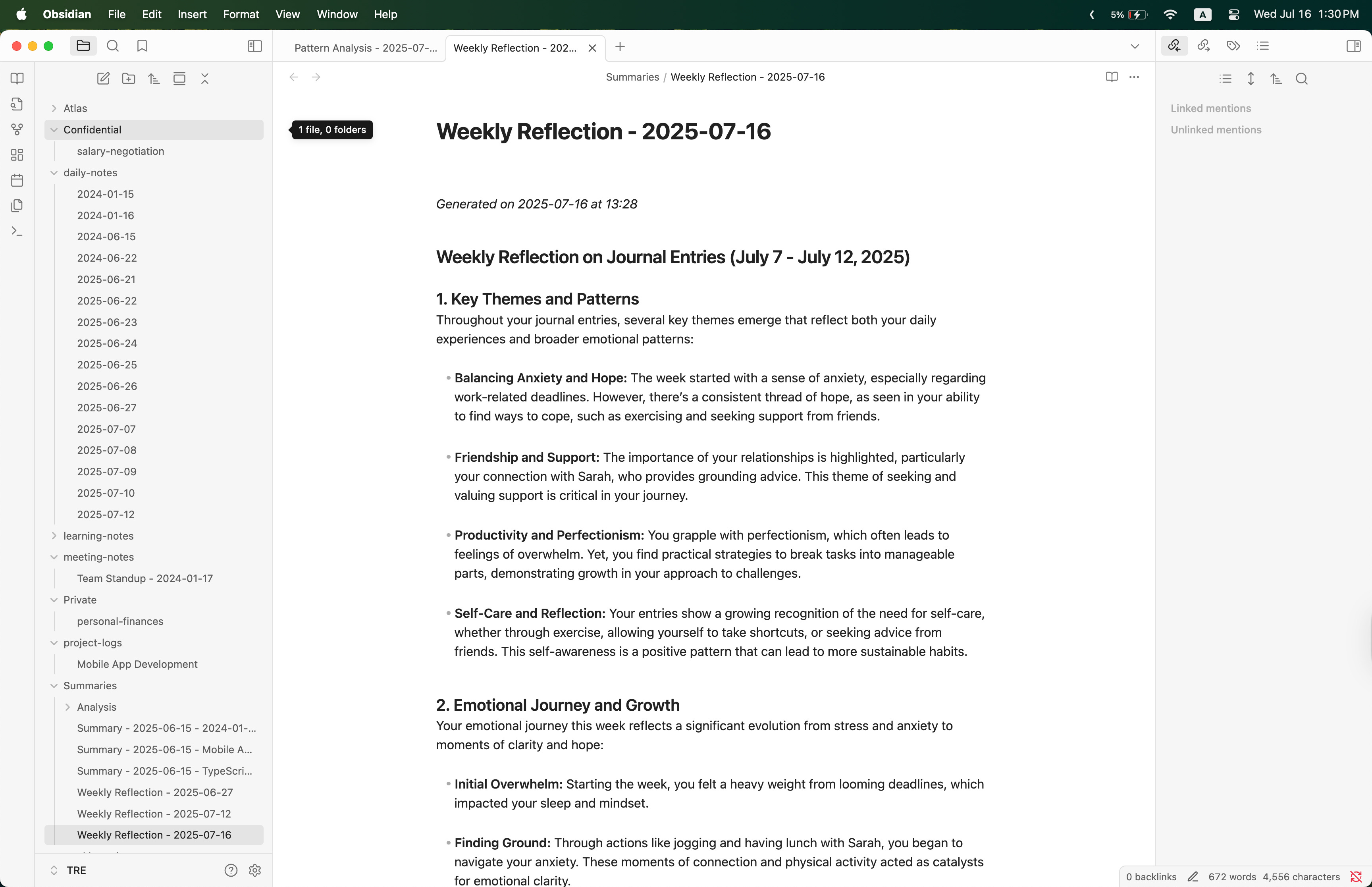 I've built what's basically a digital therapist that lives in your notes app. It reads through your daily brain dumps, identifies the patterns you're too close to see, and occasionally taps you on the shoulder like, "Hey, you've written about feeling overwhelmed seventeen times this month, maybe we should talk about that?"