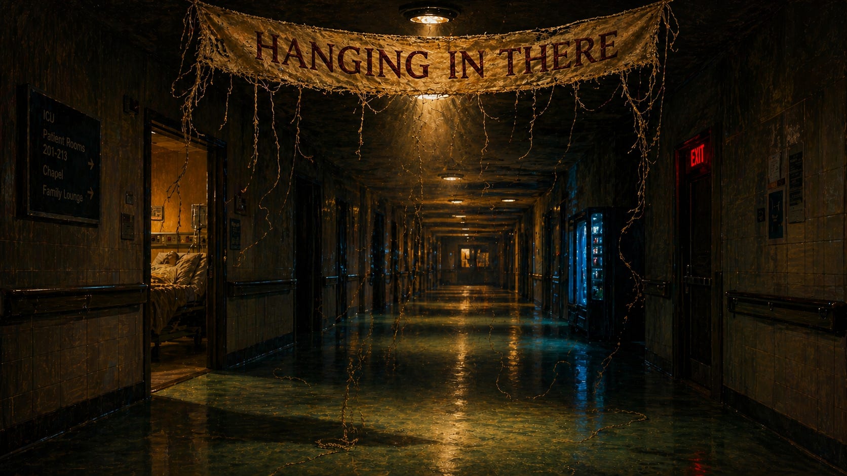You don’t know what to say when people ask how you’re doing. You say fine. You say he’s hanging in there. You’ve been saying “hanging in there” for months now and at some point those words stopped meaning anything and turned into a sound you make at people. He’s hanging in there. You’re fine. Fine.